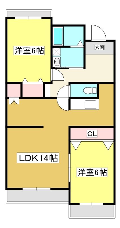 ![]() ポイント洋室にそれぞれ収納付き。キッチンにはオープンパントリーがあり、食品やキッチン家電の収納などに便利です 【間取】
