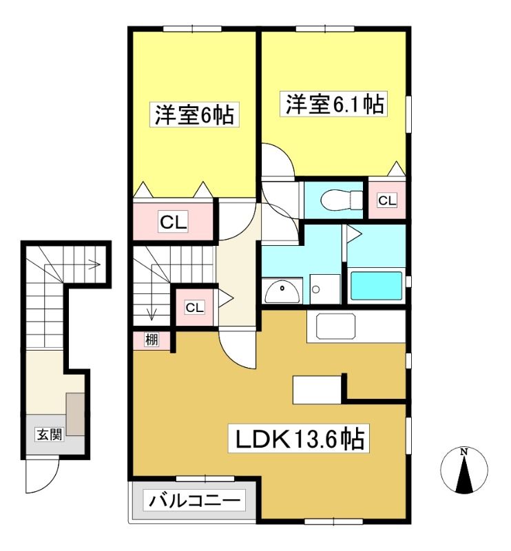 | 築年月 | 2008年9月 | 間取り | 2LDK( 洋室6.1畳/洋室6畳/LDK13.6畳 ) | 専有面積 | 61.76m2 |