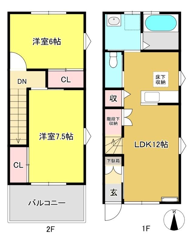 ![]() ポイント全部屋2面採光で通風良好各居室に収納もありプライバシーも守れ、水回りにも窓があるので換気性の良い2LDKメゾネットです。 【間取】