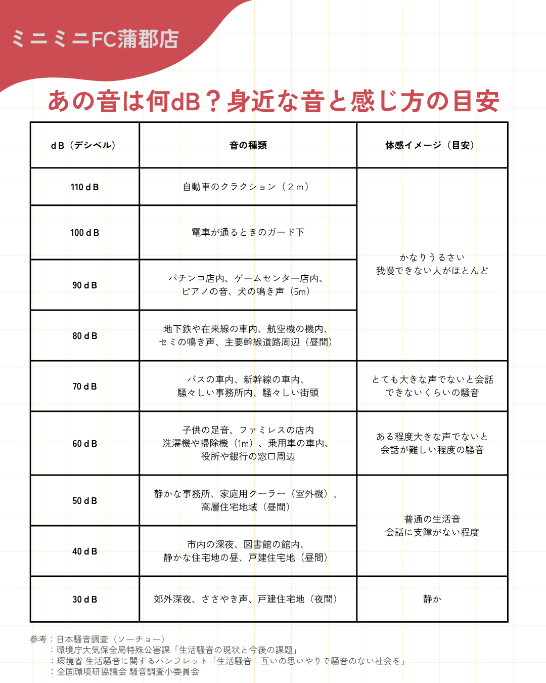 「このお部屋で感じる音は◯dB(デシベル)くらいです!」と説明されても、どのくらいの大きさの音なのかイメージするのは難しいですよね。