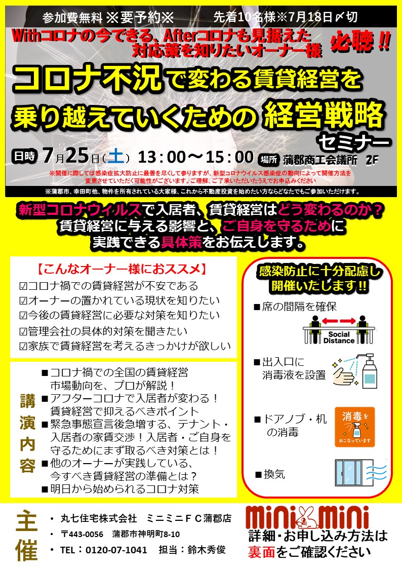 席の間隔の確保、出入口に消毒液を設置、ドアノブ・机の消毒、換気など感染防止に十分配慮したうえで開催いたしますので、コロナ禍で今後の賃貸経営が不安なオーナー様は、この機会を逃さずぜひご参加ください。