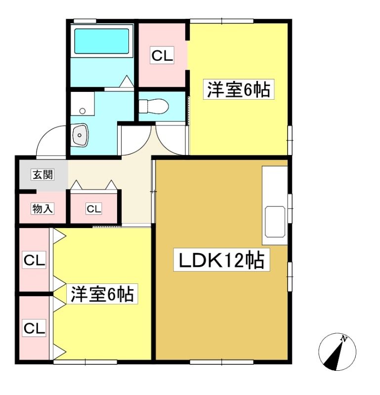 ![]() ポイントそれぞれの部屋が独立したタイプの2LDK。エアコン1台、モニターホン、追い焚き、シューズボックス設備 【間取】