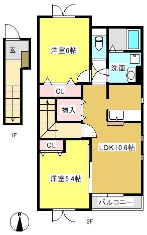 | 種別 / 構造 | アパート / 木造 | 主要採光面 | 南 | 所在階 / 階数 | 2階 / 2階 |