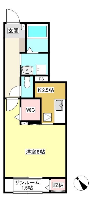 ![]() ポイントウォークインクローゼット付き8帖の1K。エアコン、インターネット無料、システムキッチンなど充実設備で快適なひとり暮らしが楽しめそうです。 【間取】
