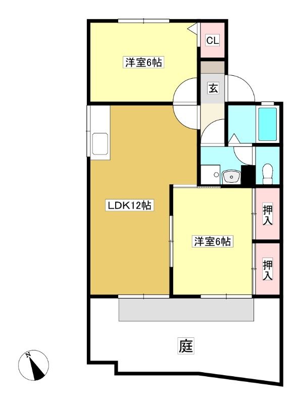 ![]() ポイントエアコン、全室照明、追い焚き、シャンプードレッサー、モニターホン設備の2LDK 【間取】