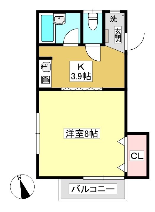 ![]() ポイント飲食店やスーパーが近くにあり、2面採光のある8帖洋間は陽当たり・通風良好で、単身の方へおすすめな1Kです。 【間取】
