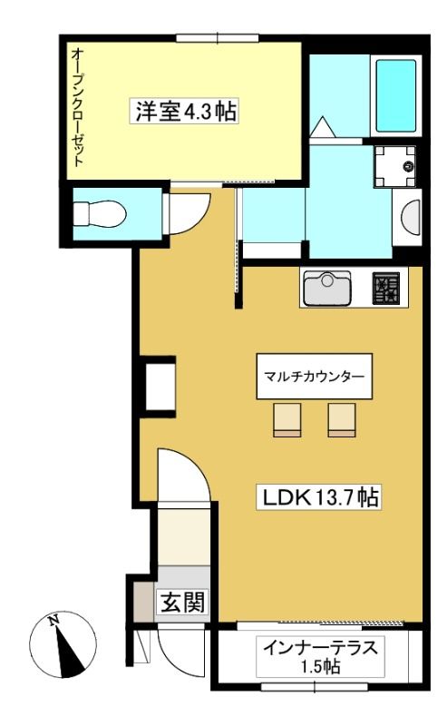 ![]() ポイントマルチカウンター、ハイチェア2脚、キッチン収納付きのおしゃれなLDK。エアコン、インターネット無料など設備も充実。 【間取】