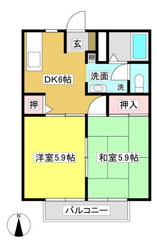 | 築年月 | 1996年2月 | 間取り | 2DK( 和室5.9畳/洋室5.9畳/DK6畳 ) | 専有面積 | 38.83m2 |