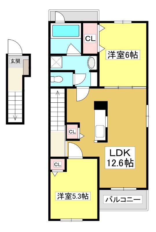 | 築年月 | 2016年4月 | 間取り | 2LDK( LDK12.6畳/洋室6畳/洋室5.3畳 ) | 専有面積 | 57.32m2 |