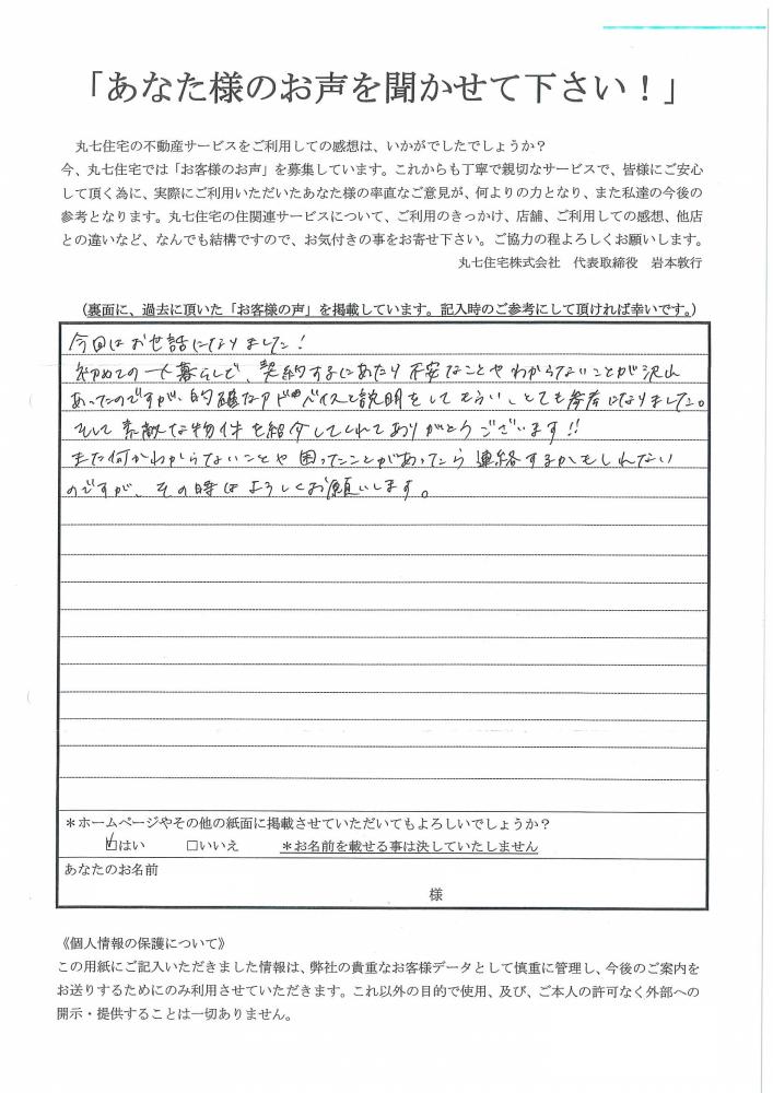 初めての一人暮らしで契約するにあたり不安なことや分からないことが沢山あったのですが的確なアドバイスと説明をしてもらい、とても参考になりました。