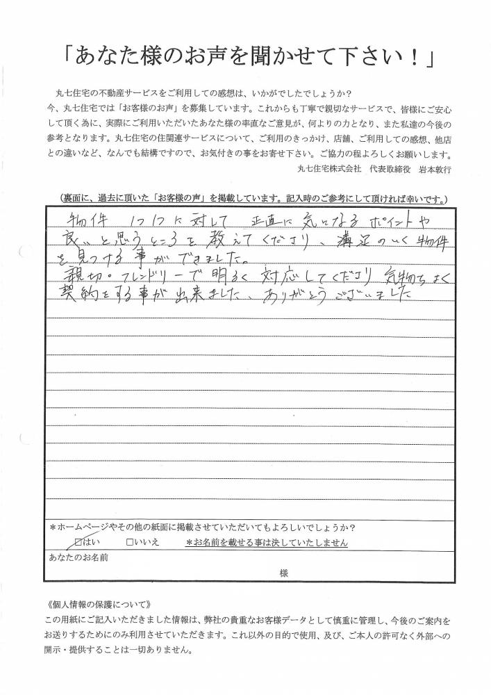 親切・フレンドリーで明るく対応してくださり気持ちよく契約をすることが出来ました、ありがとうございました。