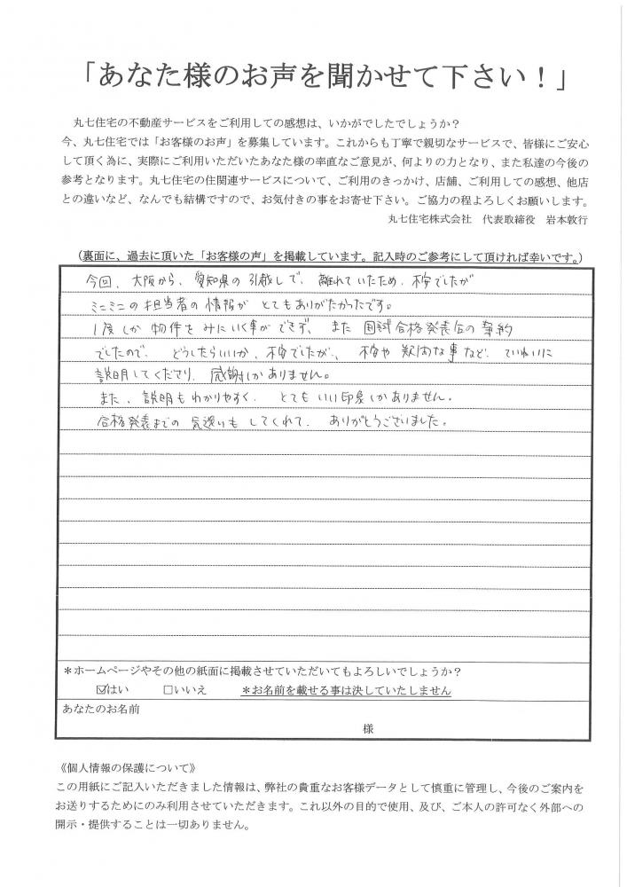1度しか物件をみにいく事ができず、また国試合格発表の契約でしたので、どうしたらいいか、不安でしたが、不安や疑問な事など、ていねいに説明してくださり、感謝しかありません。