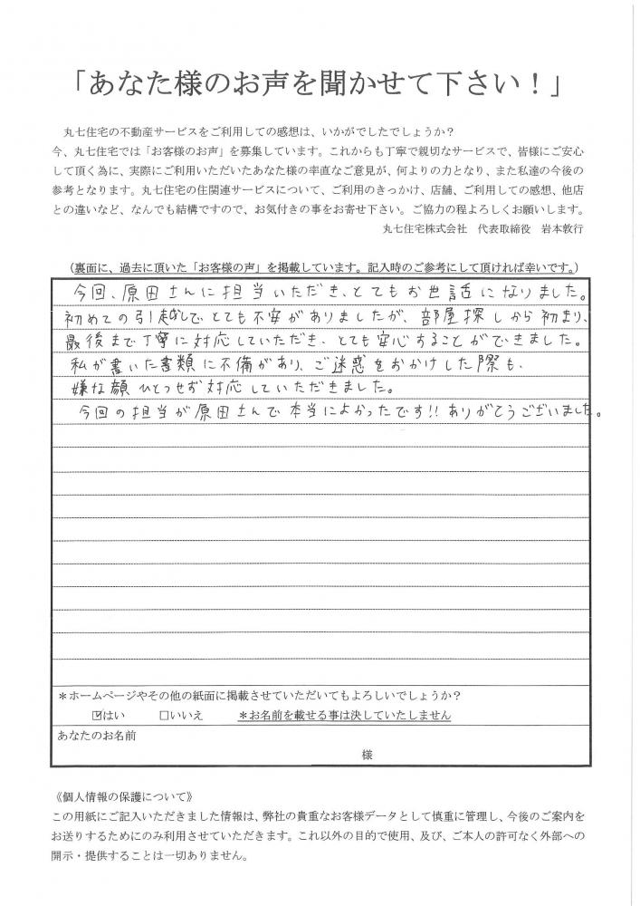 初めての引越しでとても不安がありましたが、部屋探しから初まり。最後まで丁寧に対応していただき、とても安心することができました。